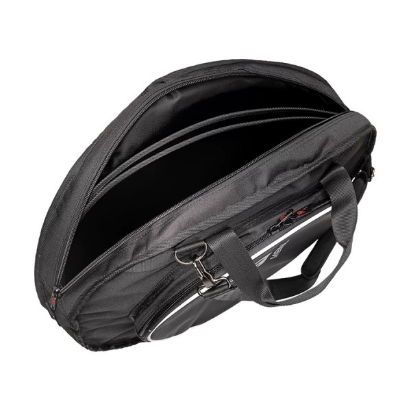 - Organización práctica: bolsillo exterior para accesorios (baquetas, llaves, limpiadores) y separadores o correas interiores para mantener los platos ordenados.