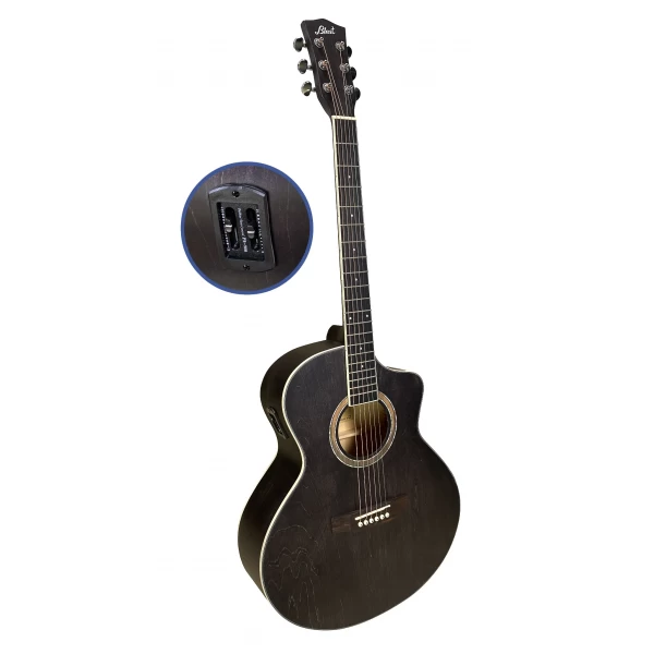Equipada con un preamp con ecualizador, permite ajustar el tono fácilmente al conectarse a un amplificador o sistema de sonido. El cuerpo con cutaway facilita el acceso cómodo a los trastes superiores, mientras que su acabado oscuro le entrega un estilo moderno, elegante y profesional.