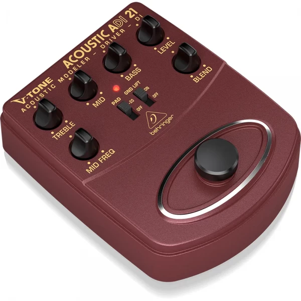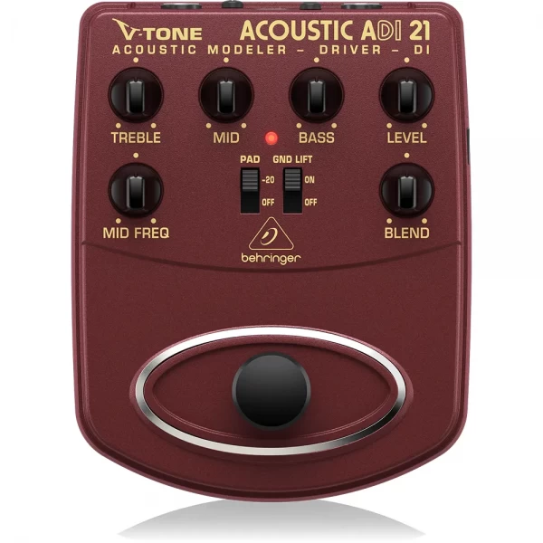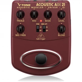 El Behringer ADI21 es un modelador/preamp DI para guitarra acústica pensado para mejorar el sonido de cápsulas piezo, suavizar el “quack” y entregar una señal lista para escenario o grabación. Incorpora ecualizador de 3 bandas con medios barribles, emulación de tubo/micrófono y salida balanceada XLR para conectar directo a consola.